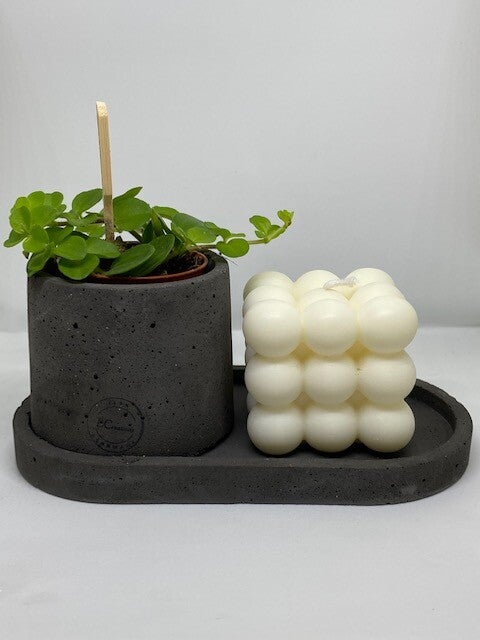 De set bestaat uit een ovalen schaal met bloempot en kubuskaars.